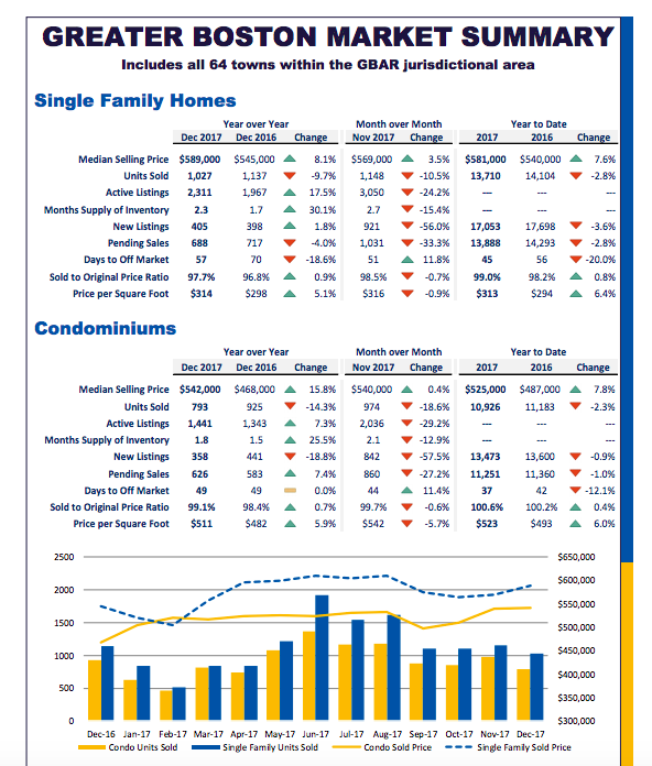Here's December 2017s Monthly Indicators Report from the Greater Boston Association of Realtors showing Boston real estate market trends.