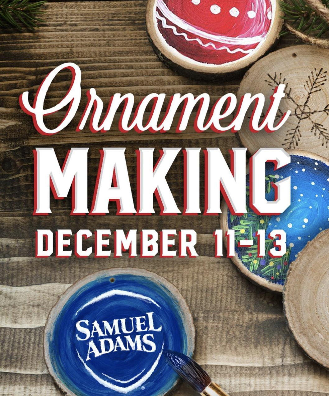 - Sam Adams Ornament Decorating - Join Harpoon in the outdoor Beer Garden and decorate your own beer-themed holiday ornament! Show off your artistic skills (or lack thereof) with their acrylic paint and natural sliced wooden ornaments. Help decorate the Harpoon tree for everyone to see or take them home to make your holiday a little extra special. Each purchase comes with 8 ornaments per person and a pack of 12 acrylic paint pots.