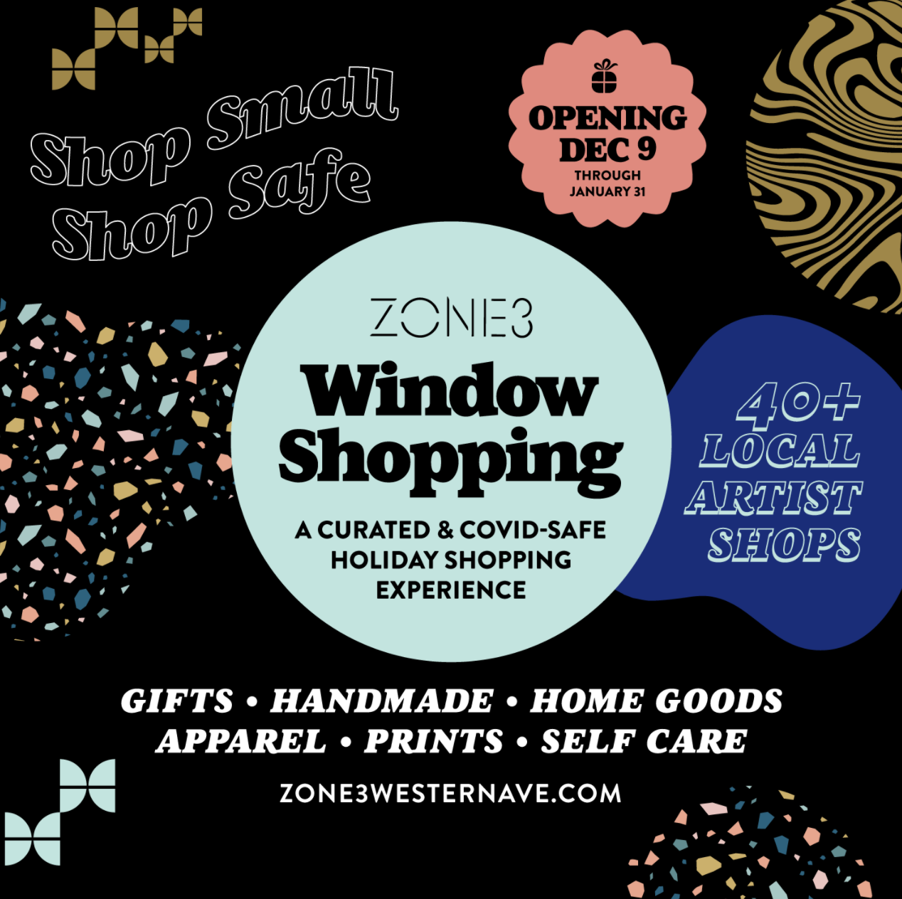- Zone 3 Holiday Shopping – Shop small, shop safe is the name of the game for Zone 3’s Window Shopping experience aimed to spark joy and highlight local makers and artists in the Boston community. Taking the Zone 3 Pop-Up Artist Shop to the streets, a curated series of merchandised windows and displays featuring over forty artists will be installed throughout the Western Ave corridor. The route will lead visitors on a unique and socially distanced shopping experience with stops from Allston to Harvard Square and will be up through December and January.
